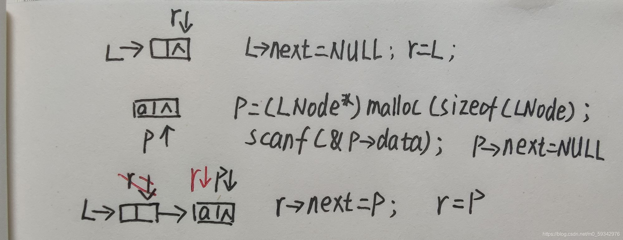 - 初始时,r同L指向头结点