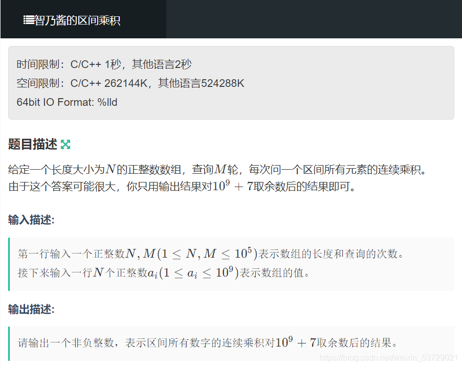 给定一个长度大小为N的正整数数组,查询M轮,每次问一个区间所有元素的连续乘积。