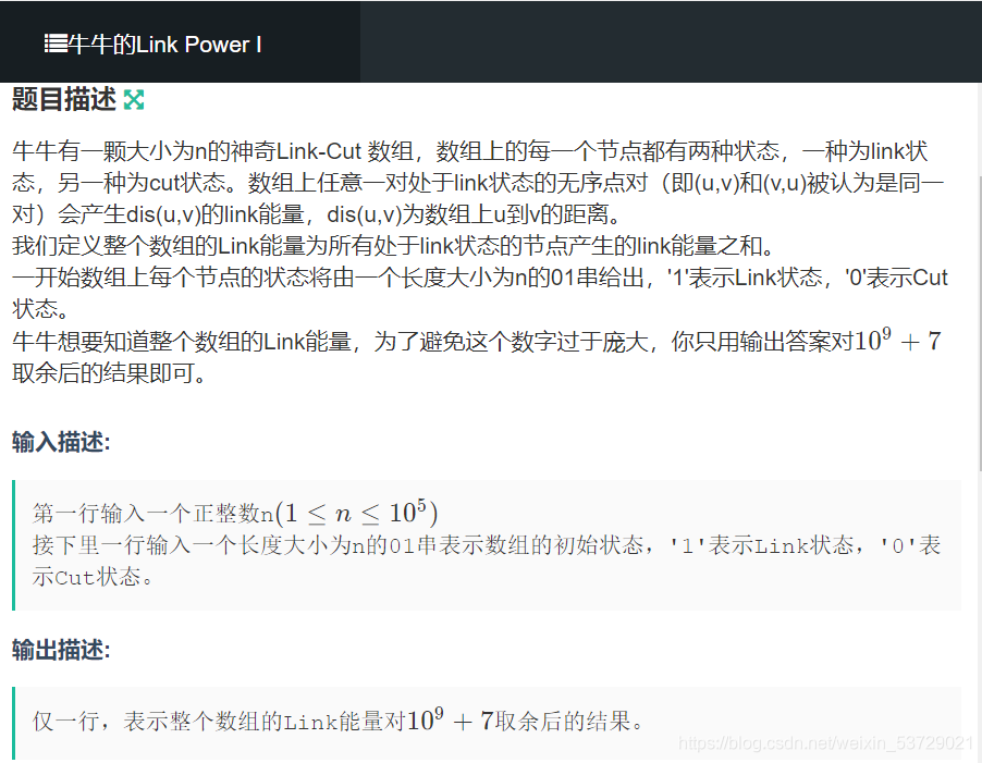 牛牛想要知道整个数组的Link能量,为了避免这个数字过于庞大,你只用输出答案对10^9+7取余的结果即可。