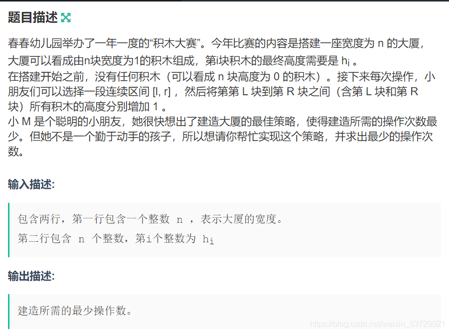春春幼儿园举办了一年一度的“积木大赛”。今年比赛的内容是搭建一座宽度为 n 的大厦,大厦可以看成由n块宽度为1的积木组成,第i块积木的最终高度需要是 hi 。