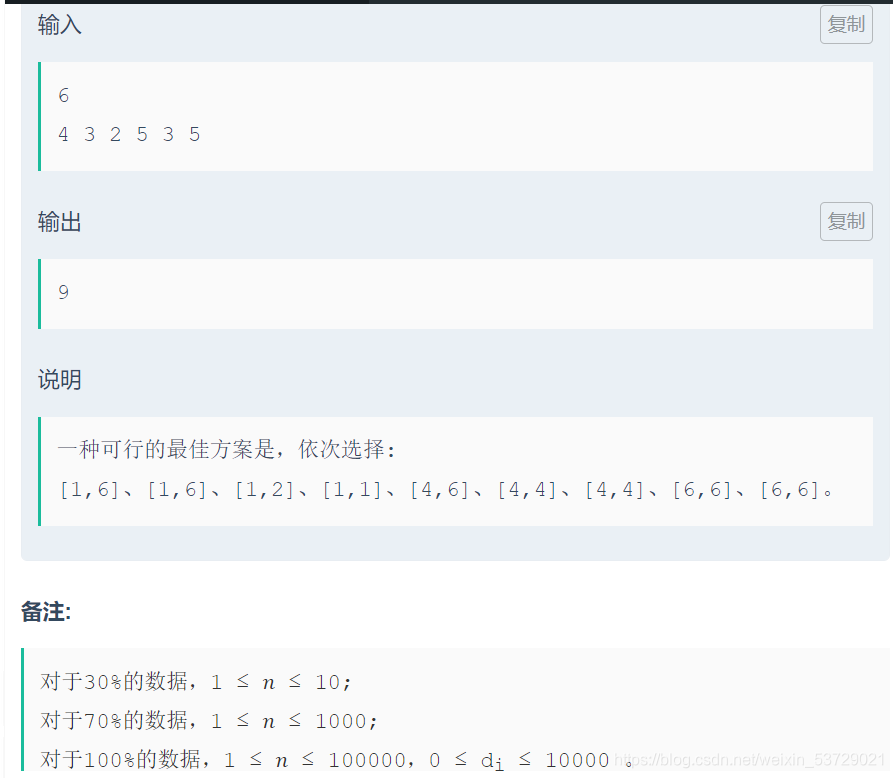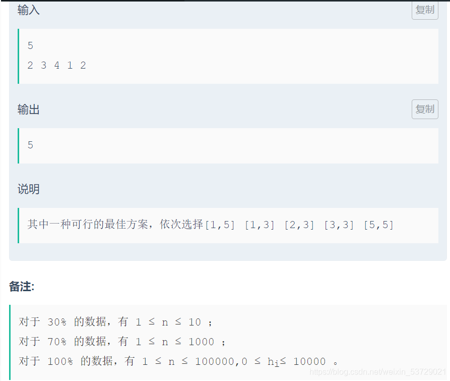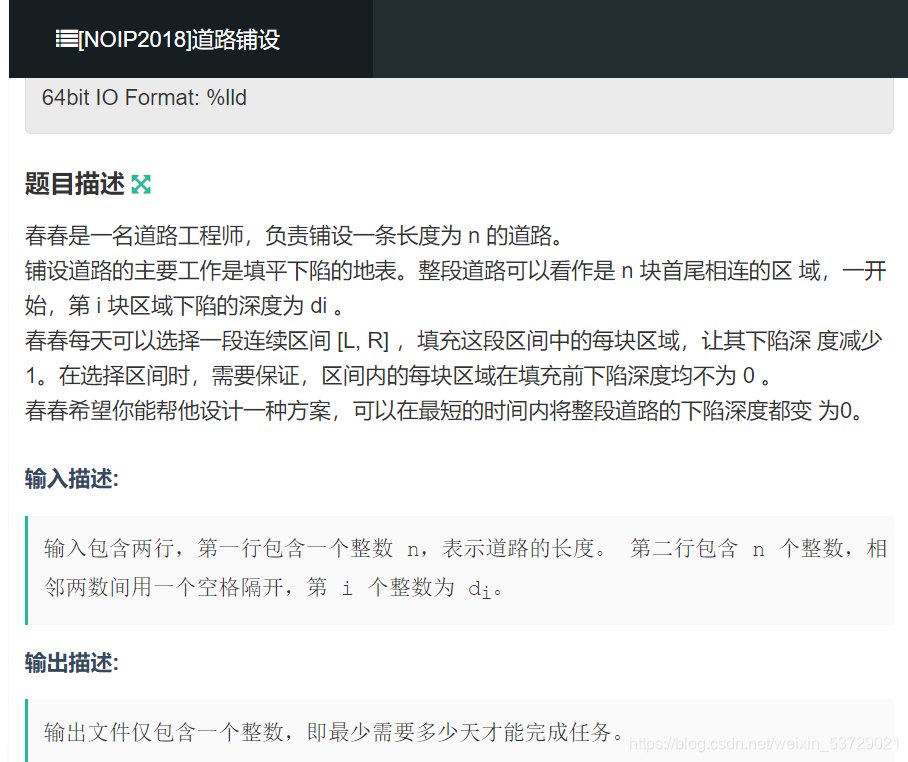 春春是一名道路工程师,负责铺设一条长度为 n 的道路。 铺设道路的主要工作是填平下陷的地表。整段道路可以看作是 n 块首尾相连的区 域,一开始,第 i 块区域下陷的深度为 di 。 春春每天可以选择一段连续区间 [L, R] ,填充这段区间中的每块区域,让其下陷深 度减少 1。在选择区间时,需要保证,区间内的每块区域在填充前下陷深度均不为 0 。 春春希望你能帮他设计一种方案,可以在最短的时间内将整段道路的下陷深度都变 为0。