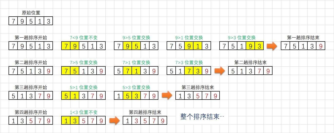 - 第一趟:第一个元素到最后一个元素之间两两比较,大的元素往后移,这样下来就找到了最大元素。