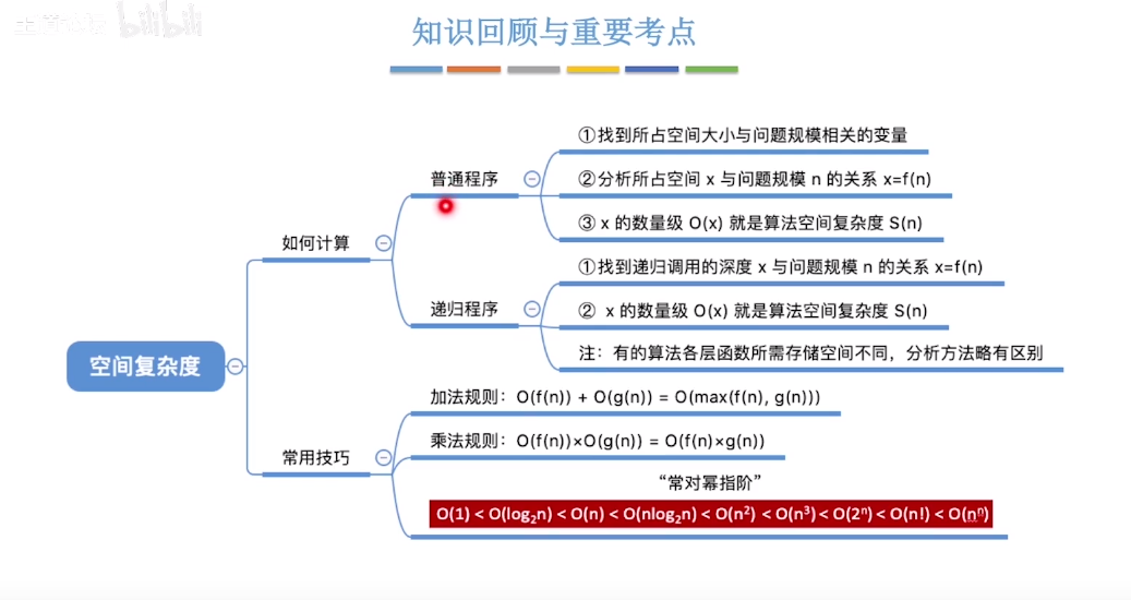 (1)基本概念 算法是解决问题的操作步骤。 特性:有穷的(程序可以无穷)、确定的、可行的、有输入和输出的。 (2)时间复杂度(所用时间与问题规模n的关系) 不能只用事后时间统计,应该事前预估时间开销T(n)。 初级:计算程序中每个语句的执行次数。 中级:直接选最高阶为T(n)。 高级:顺序执行的代码只影响常数项,可以忽略。对于循环语句,只需要分析循环中的一个基本操作的执行次数和n的关系。对于多层嵌套循环:只需观察最深层循环的执行次数。 PS:对于输入数据不定影响输出的情况,应计最坏时间复杂度和平均复杂度。 (3)空间复杂度(内存开销S(n)和问题规模n的关系) 程序运行时的内存需求:将代码装入内存,存放数据(局部变量和参数) PS:只需关注存储空间大小和问题规模n相关的变量。