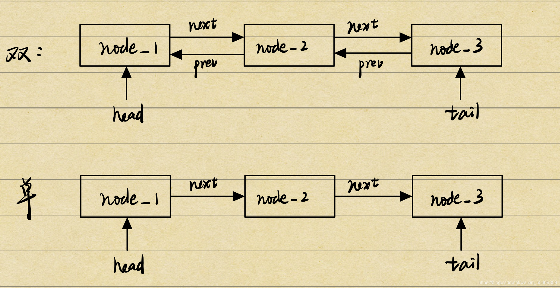 ????????从本质上来讲,单双链表的意义上相同的,所以如果单链表能理解,双链表就特别容易理解 了,我用一个手画草图来演示: