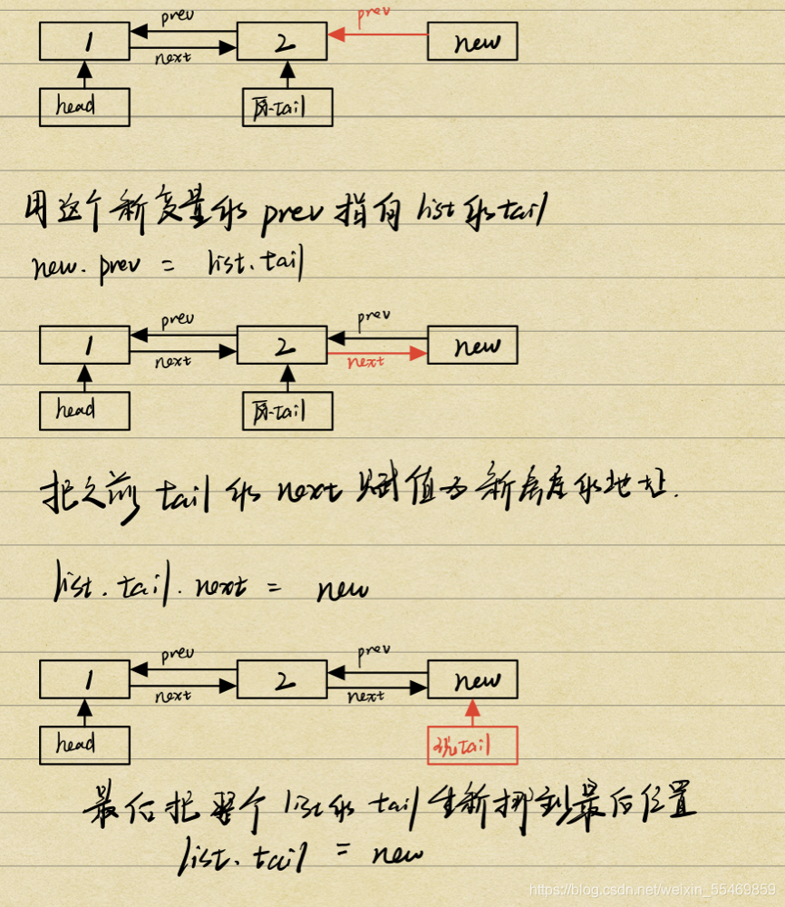 ????????大体思路就是先用新的node的prev指针指向链表的tail,在用tail的next指针指向这个新的node,最后吧tail的位置挪到这个新的node的位置即可。