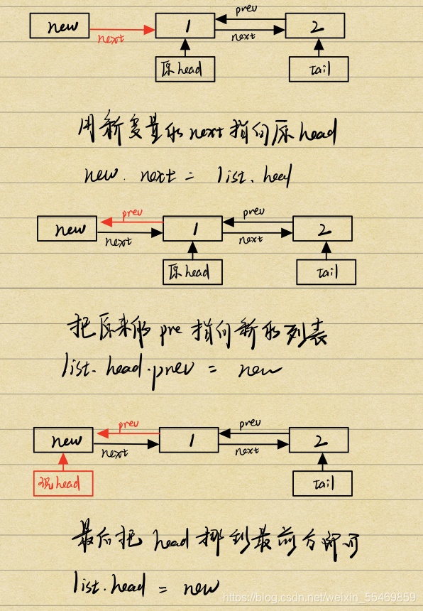 ????????先用新的node的next指针指向链表的head,在用head的prev指针指向这个新的node,最后吧head的位置挪到这个新的node的位置即可。?
