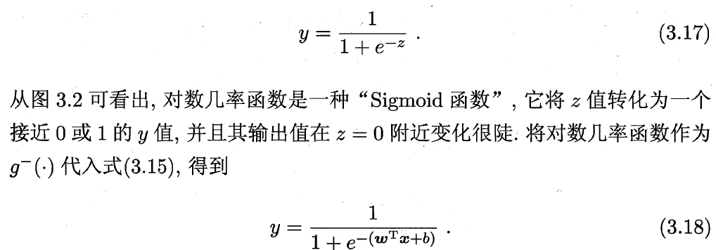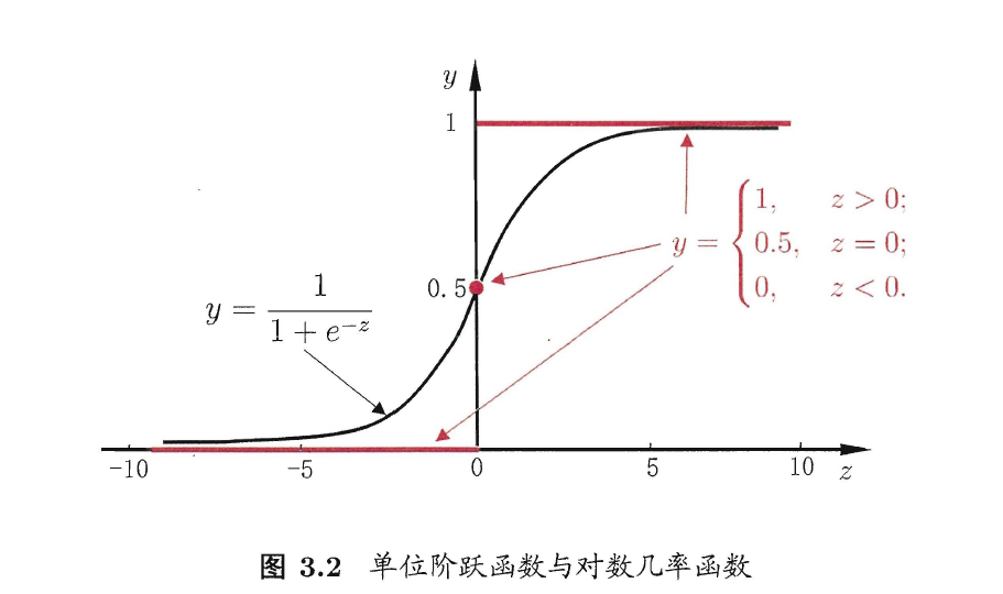 - 对数几率回归:又叫逻辑回归。它是为了解决线性回归不能分类的问题,找一个单调可微函数将分类任务的真实标记y与线性回归模型的预测值联系起来.