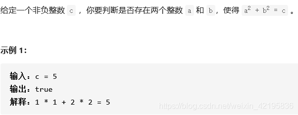? ? ? ? ?这道题目看上去不是很难,但是想要快速的通过却不是很容易的事情。按照正常的逻辑,如果所给的数值开方后是个整数,则其必定存在两个整数的各自平方和相加的结果是c,如果开方后得到的结果并不是整数,此时就要从0开始遍历到sqrt(c)之间,判断在此区间中是否会存在两个数的各自的平方相加的结果是等于c的。最直观的解决方法就是两层遍历,分别从0开始依次累加进行判断。这里需要注意的是当所给c较大时,一方面得到的平方后的和会超出 int 型的范围,另一方面是,c较大时,两层遍历所需要的时间会超出本题的时间限制。因此就要进行简化,是否能够将两层循环转化为一层循环,进而缩小所需要的时间。
