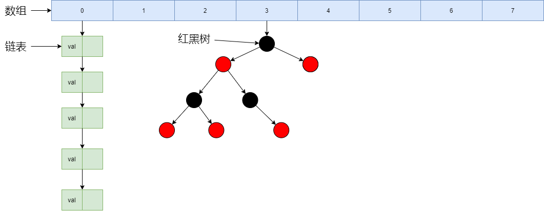 在HashMap中数据的存储是用数组+链表+红黑树构成的,每个数组的索引位置在注释中被称为一个hash bin,可以翻译为哈希桶,当有新元素添加的时候先通过hash函数计算出元素在数组中的桶位置,如果桶中还没有元素,直接插入新元素,如果位置上已有元素,表示hash值出现了碰撞,此时要将新元插入到此桶中链表的链尾节点,如果当桶中的元素数超过8(也就是成员变量TREEIFY_THRESHOLD)的时候,将此位置上的链表转成红黑树进行存储。
