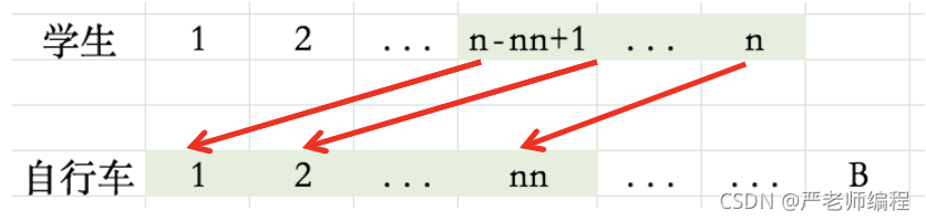 算法题,考察了二分法和贪心法的综合应用,跟题目提示,采用二分法进行查找,最多能租到自行车的同学数范围必然是在0-n之间,通过二分查找,每取一个人数时,用贪心算法求得此刻所需用到的最小经费,然后判断其是否不超过A,若是,则表示还可能有更多的人能借到自行车,继续往右边进行二分查找,否则往左边进行二分查找,直到找到最多的刚好满足消耗经费不超过A的租到自行车的人数。 从main函数开始,首先是两个排序,分别对学生的零钱,自行车的租金进行排序,这个是便于贪心法计算最小经费。然后就是标准的二分查找了,若当前查找值满足,则更新ans为mid,然后往右查找可能的更大的值,否则往左查找,⑤mid-1