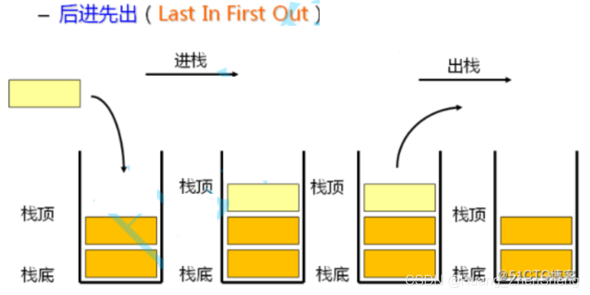 栈:一种特殊的线性表,其只允许在固定的一端进行插入和删除元素操作。进行数据插入和删除操作的一端称为栈顶,另一端称为栈底。栈中的数据元素遵守后进先出LIFO(Last In First Out)的原则。 压栈:栈的插入操作叫做进栈/压栈/入栈,入数据在栈顶。 出栈:栈的删除操作叫做出栈。出数据也在栈顶。