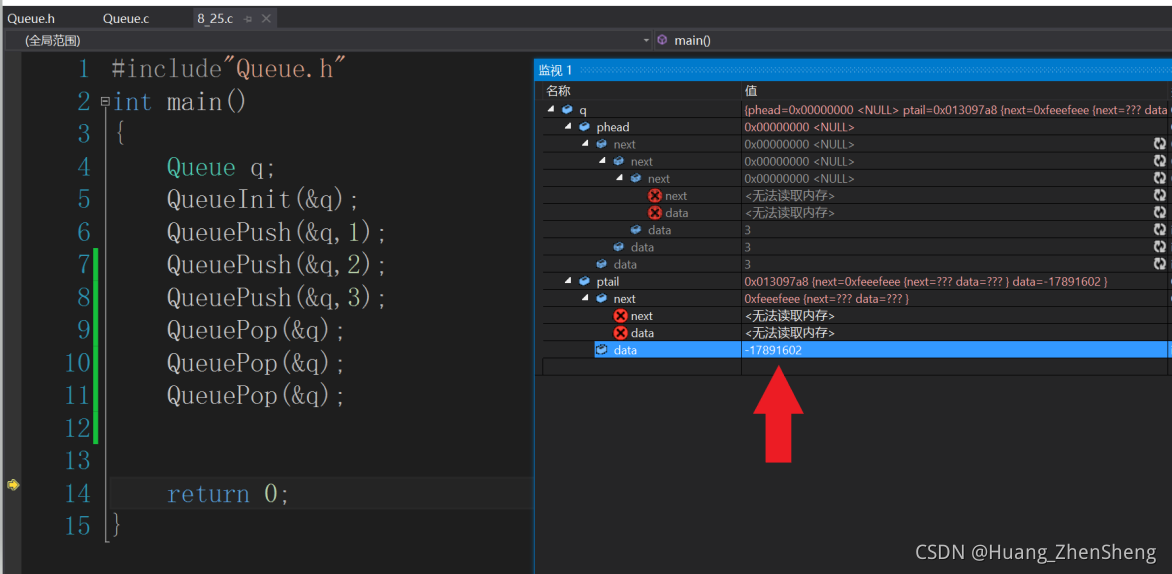 QDataType QueueFront(Queue* pq)//访问头的数据
