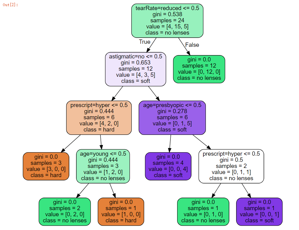 1、使用决策树预测隐形眼镜类型,隐形眼镜数据集(lenses.csv)是非常著名的数据集,它包含很多患者眼部状况的观察 条件以及医生推荐的隐形眼镜类型。隐形眼镜类型包括硬材质、软材质以及不适合佩戴隐形眼镜。 要求:读取lenses.csv中的隐形眼镜数据集,构造决策树和画出决策树.(采用cart算法构造决策树) 预测[‘young’,‘hyper’,‘no’,‘normal’]适合戴那种隐形眼镜