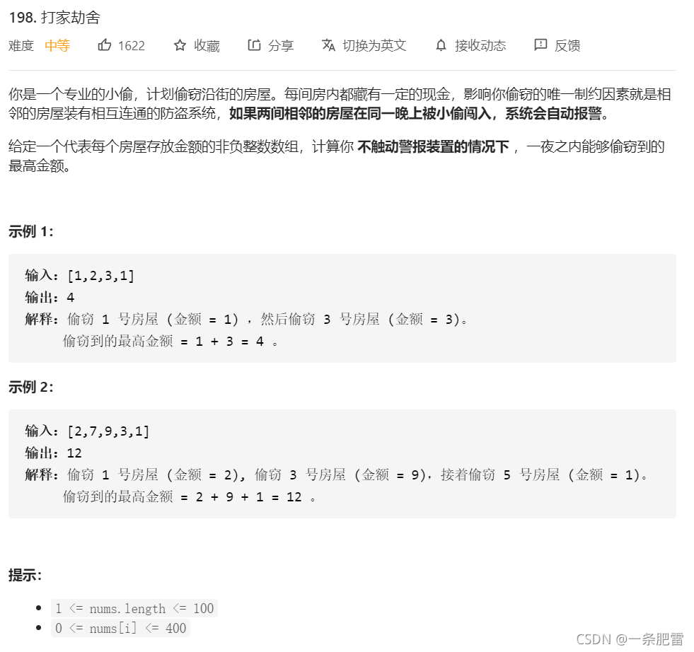 200道大数据面试常考Leetcode算法题(动态规划再进阶(序列类动态规划问题)篇)198-打家劫舍