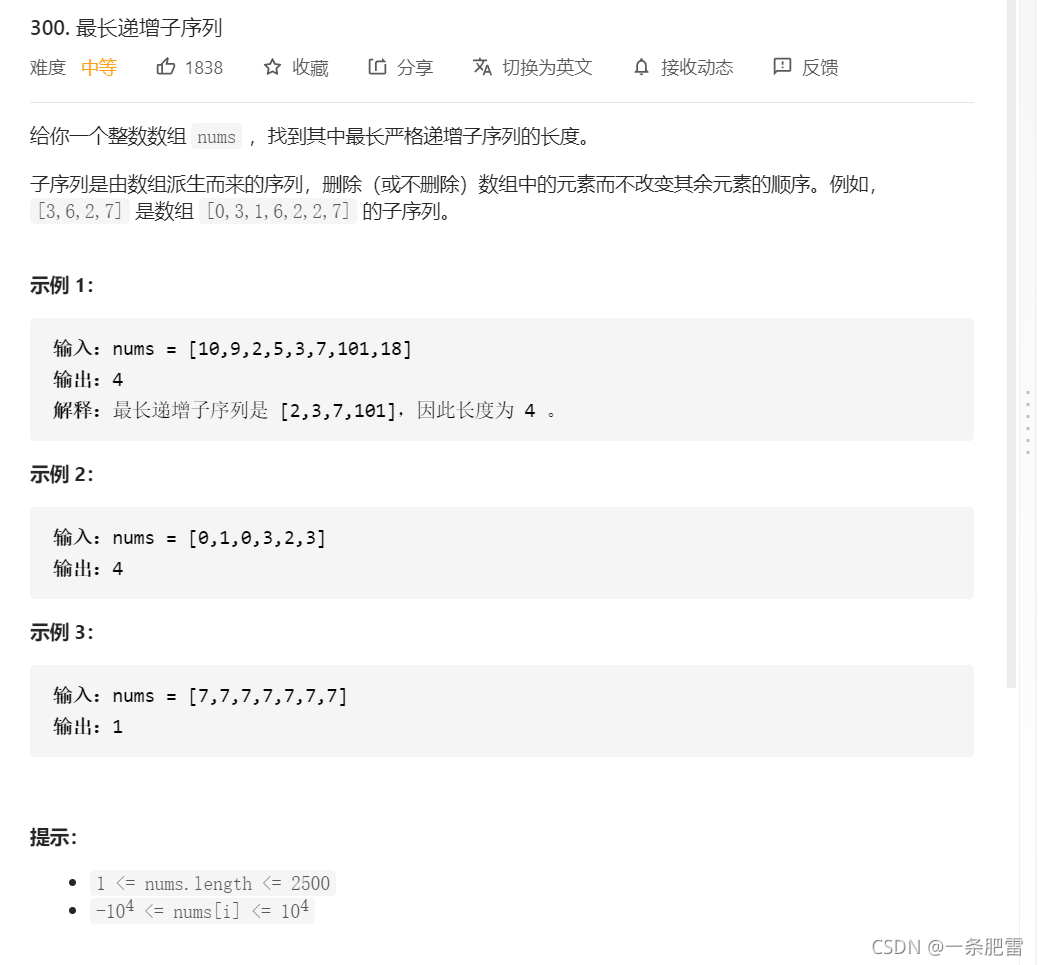 200道大数据面试常考Leetcode算法题(动态规划再进阶(序列类动态规划问题)篇)300-最长递增子序列