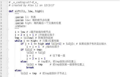归并排序:假设两边分别有序,把两边合到一起使其整体有序。参数为low,mid,high,li:令i=low,j=mid+1,tmp=[],当升序排列时,当左右两边都有数的时候:依次比较li[i]和li[j]的大小,选择小的一个添加到tmp列表中去;当只有一端有数的时候,直接将剩下的数全部添加到tmp列表后面去,因为剩下的数是有序且大于之前添加的数的。然后做递归:当low<high,即最少有两个数的时候,先求出中间值mid,然后左右分别做递归,递归之后再对最小层的数做排序。