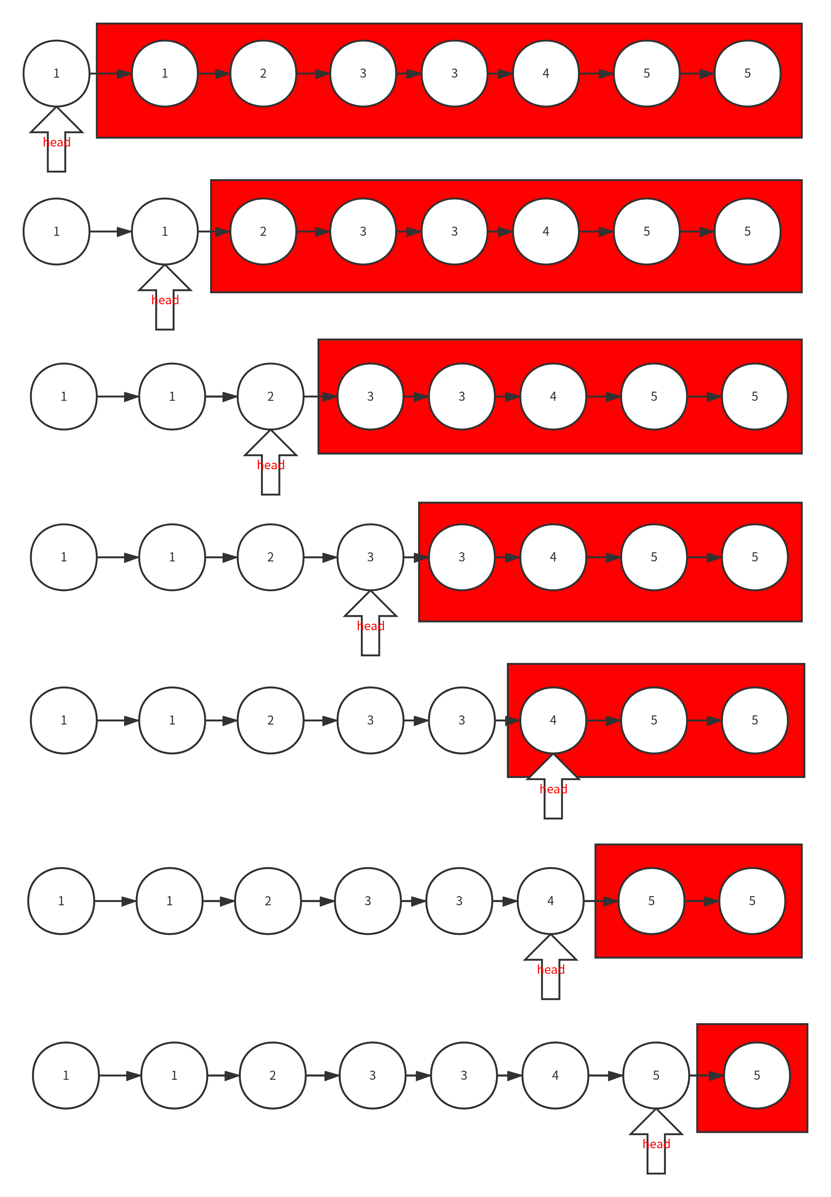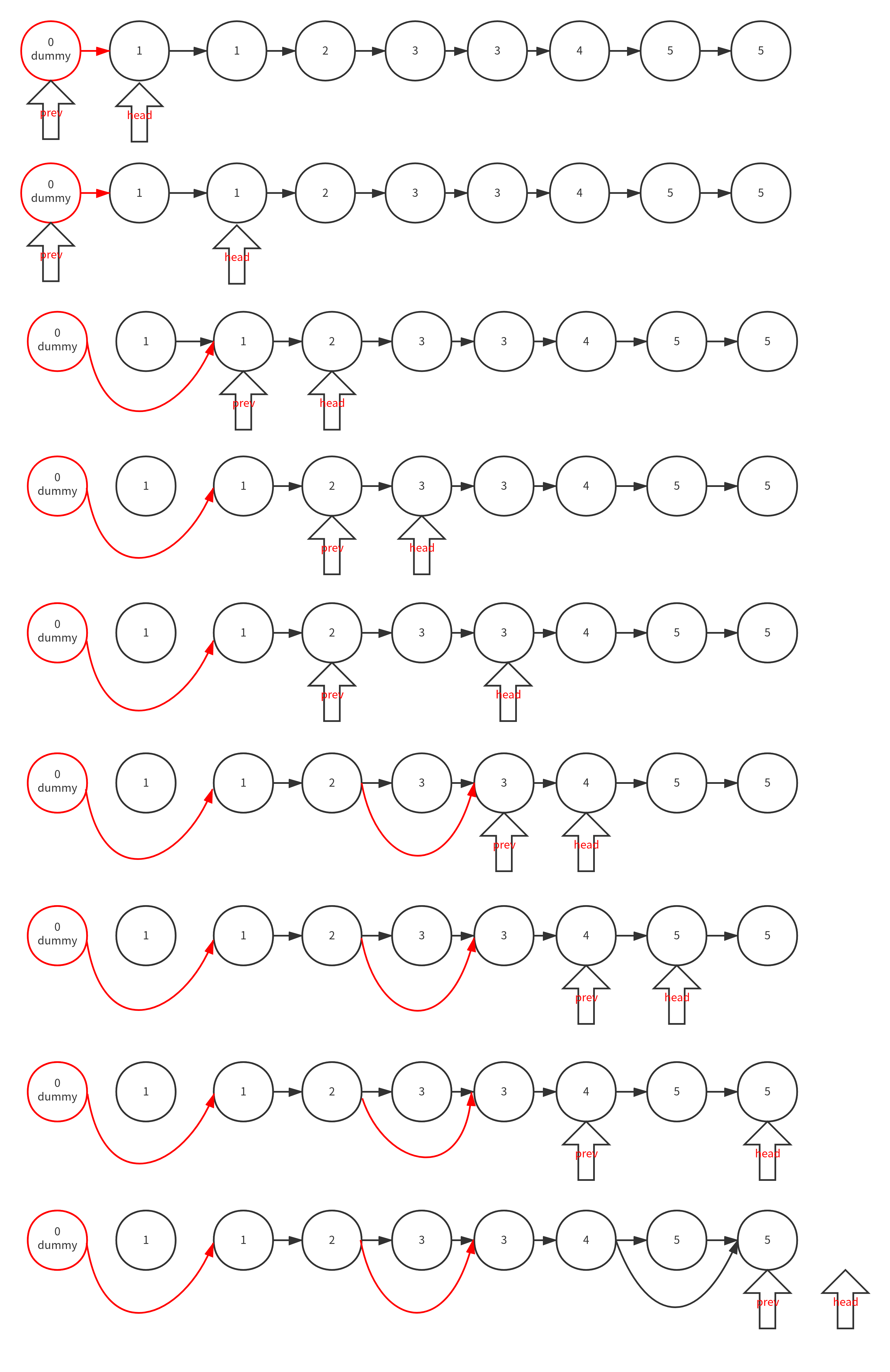 ????????存在一个按升序排列的链表,给你这个链表的头节点 head ,请你删除链表中所有存在数字重复情况的节点,重复数字只保留一次。