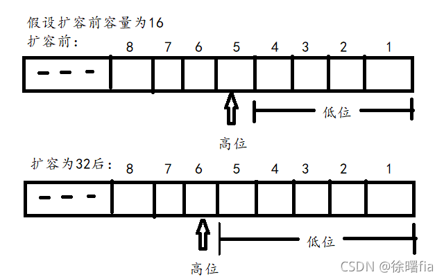 高位就是旧数组长度写成二进制,数据为1的那一位算高位,1右边的都是低位。 例如:16 写成二进制(为了方便只写8位):0001 0000 那么第5位就是高位。