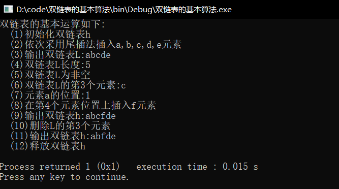 printf("双链表的基本运算如下:\n");