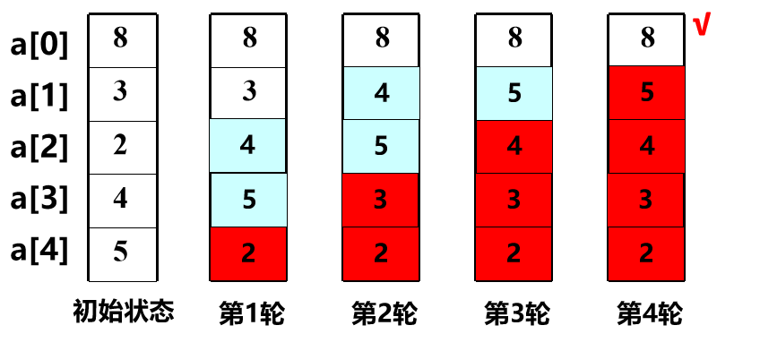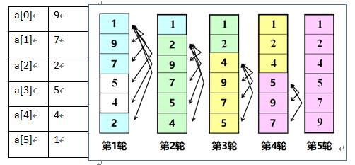 根据冒泡每两个轻的在上,重的在下思想进行排序,看代码: