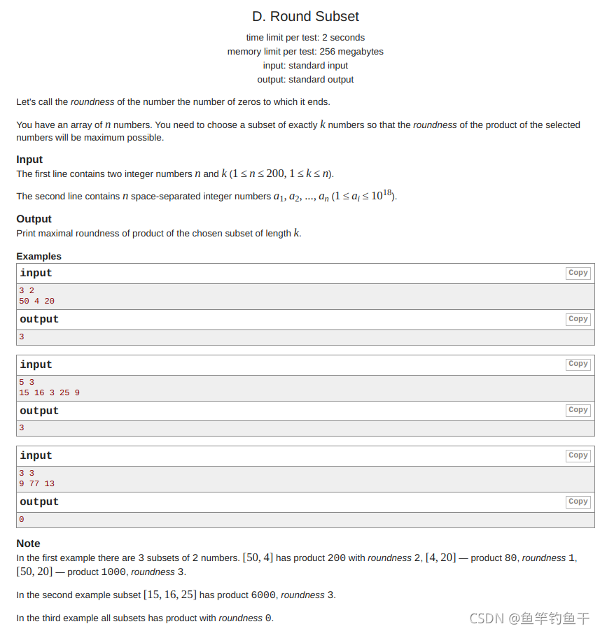 末尾0的个数那就要统计2和5的个数,先预处理每个数能贡献多少2和5 选K个数容易想到01背包,接下来思考动态规划部分 原问题:一个长度为 n 的数列,要求你从中选出 k 个数,使得这些选出的数的积的 roundness 值最大。 子问题:一个长度为i的数列,要求你从中选出 j 个数,使得这些选出的数的积的 roundness 值最大。 尝试列出转移方程,令