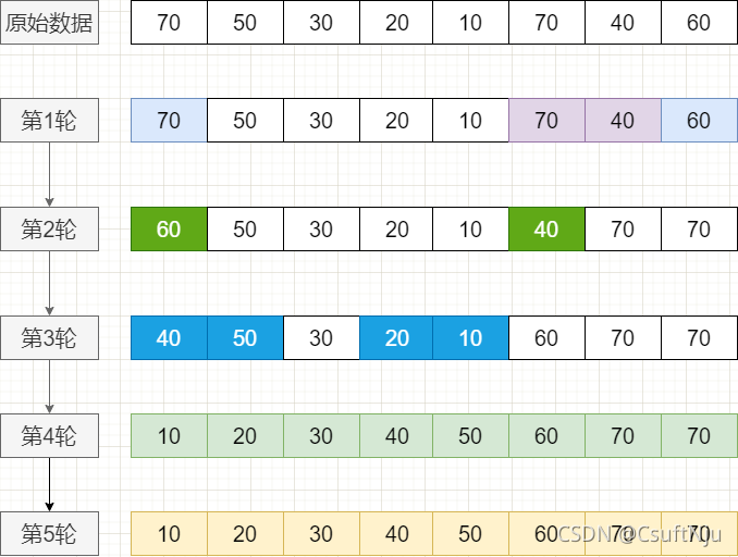 接下来对十位数、百位数也按照这种方法进行排序,最后就能得到排序完成的序列。