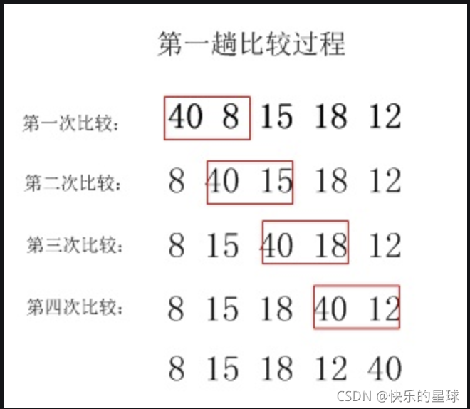 💡:当我们要把10个数字进行冒泡排序时,我们可以这样思考该问题,把问题转化为有10个人来比武,我们该如何确定其武力的高低呢?我们可以采用打擂台的方法(为了方便描述问题,给这10个人编号为0至9),我们先假设0号武力最强,让他当擂主守擂,然后1~9号不服,因此我们让1~9号依次上擂台比武,若0号赢了说明其有实力,让他继续打后面的人,若输了则代表0号没有实力,则让赢的人当擂主继续接受后面人的挑战。这样下来最后站在擂台上的一定是所有人中实力最强的,则给他第一名的奖牌,让他去观战。然后我们重复该思路在剩余9个人中,决出最强者,拿到第二名的奖牌,以此类推,当第九轮时我们将发放第九名的奖牌,这时1~9名都已经确定了,那么剩下的那个人一定是第十名。所以我们有这样的规律,n个人比武我们最多比n-1轮。