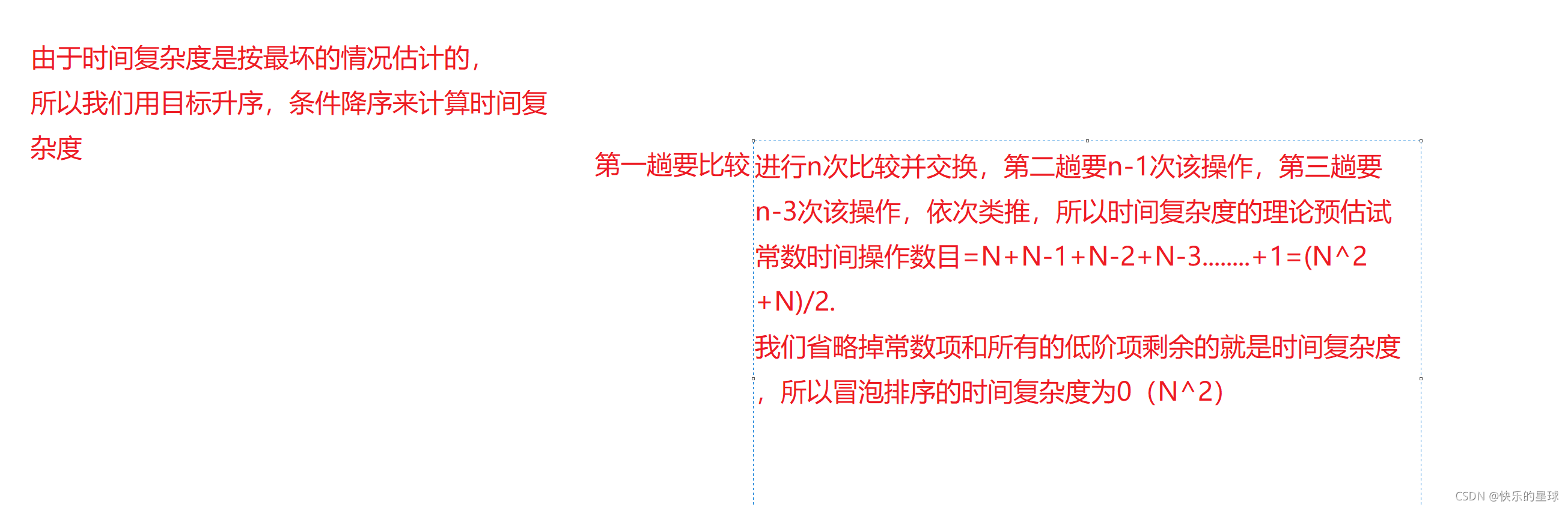 至于为什么n个数最多是n-1次,这种最多的情况是在每一个元素都错位的基础上(意思是每一个元素在一开始的位置和最终有序的位置不一致,即目标升序,开始降序),那么我们就要在0~n-1范围上通过上述方法把最大值放在n-1位置上,再在0~n-2范围上重复该操作,依次类推,因为所有数都是错位的所以每一次比较都是必要的,那每一次操作均不可以少,所以是n-1次。