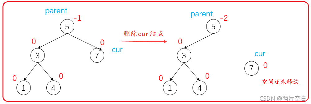 ????????注意:1.先不要释放结点的空间。为了后面更新结点平衡因子。