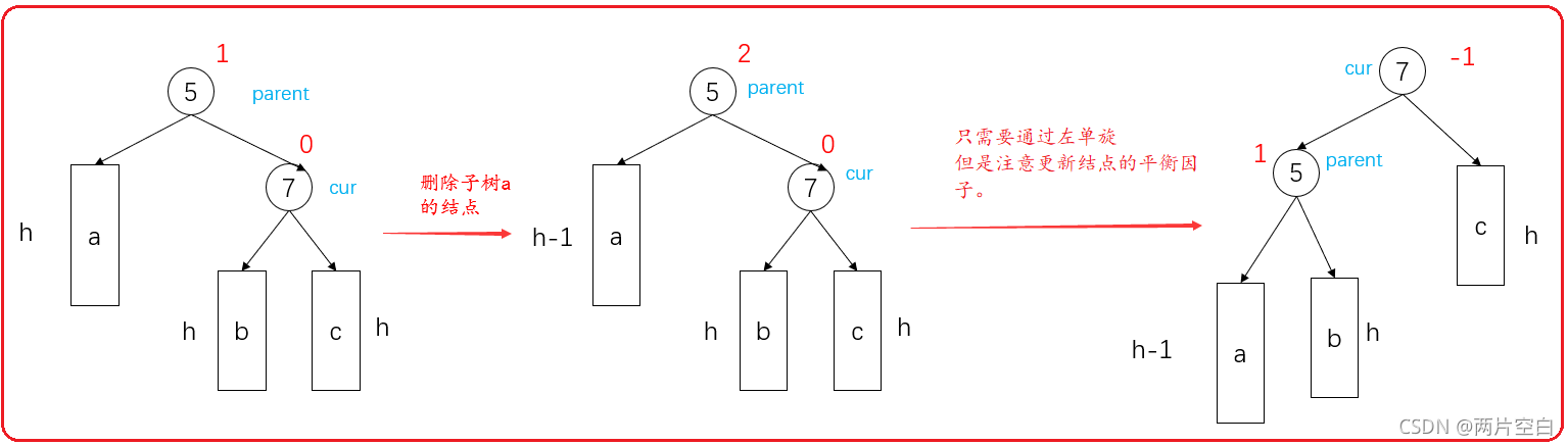 - 更新完结点的平衡因子等于0,此时需要继续往上更新。此时,没删除时,结点的平衡因子要不是1,要不是-1,更新完后,平衡因子等于0,说明高度减少,会对上面结点的平衡因子产生影响。