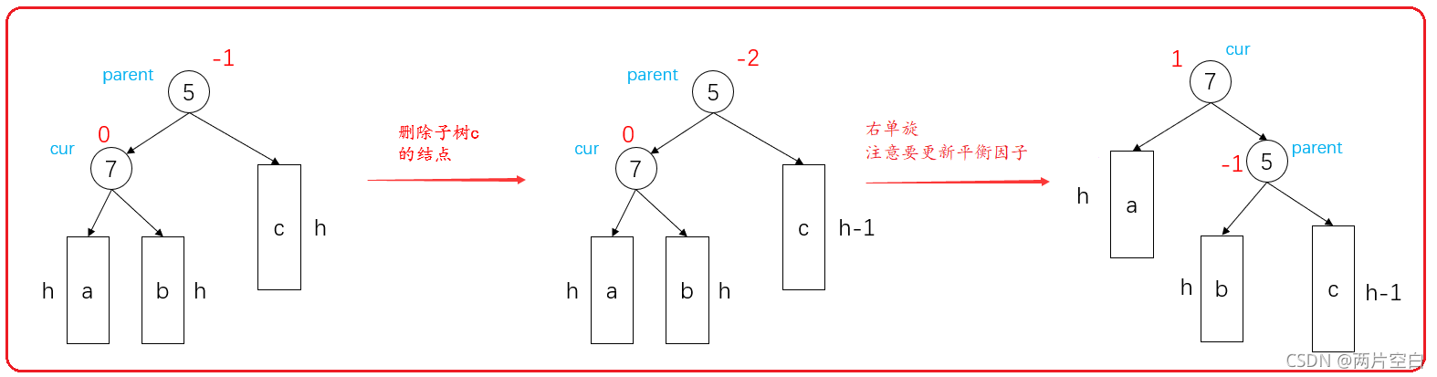 ? ? ? ? 当删除的平衡因子在右子树时,当前结点的平衡因子 --,右子树高度减1。
