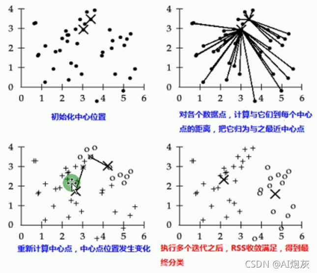K-means是无监督学习方法,对于分类问题需要输入分类数目,初始化中心位置。对于硬分类问题,以距离度量。