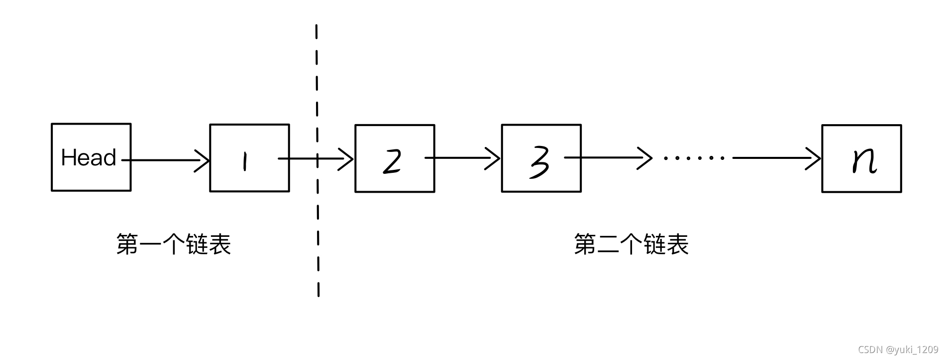 那么我们该如何实现呢?我们可以将一个要倒置的链表断为两个链表。第一个链表,是头结点和第一个节点。第二个链表是,第二个节点和其后面所有节点构成的。