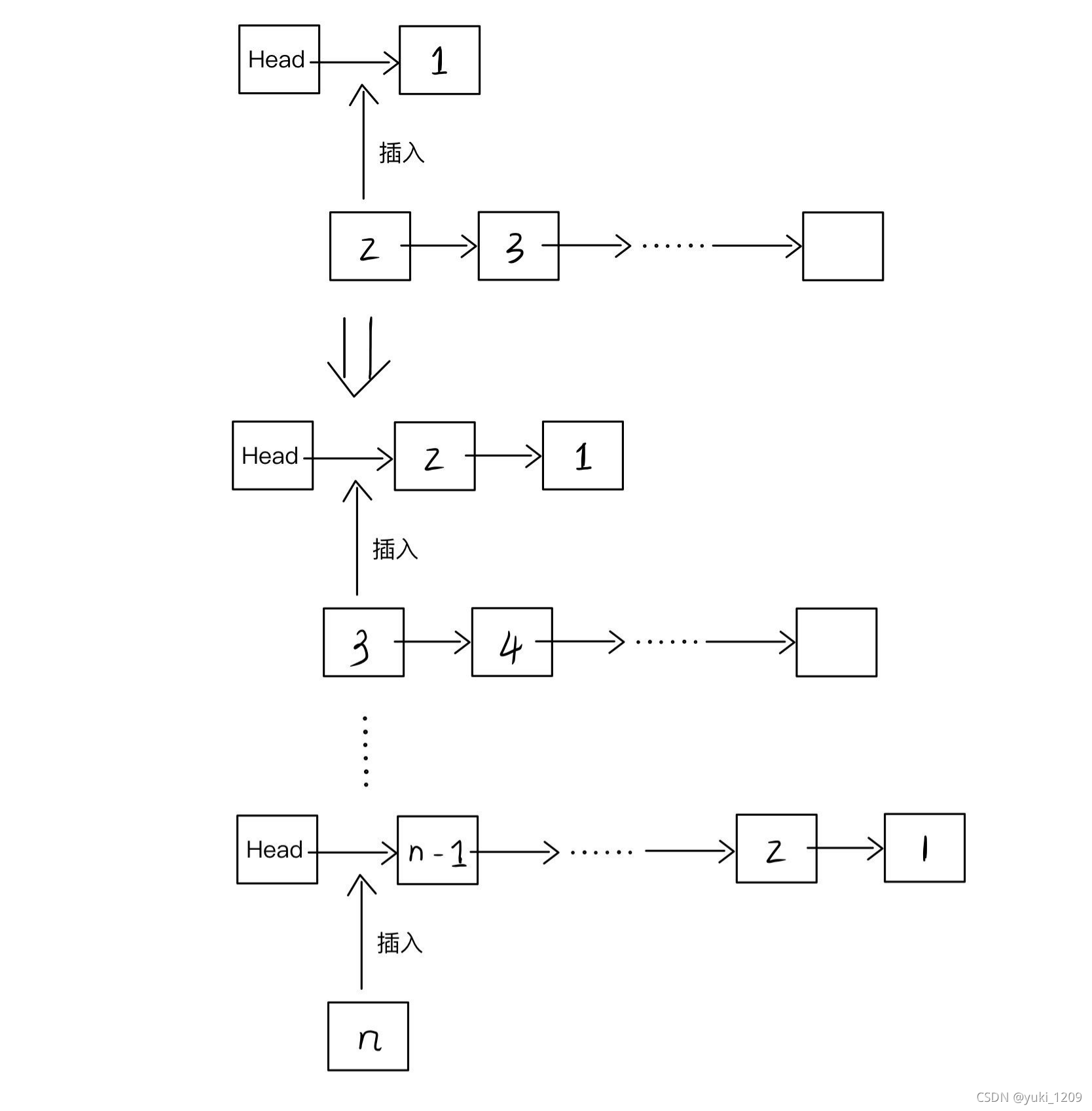 再依次将第二个链表的第一个节点插入到头结点的后面(第二个链表的第一个节点插入后,第二个节点就变成了第二个链表的第一个节点),这样就实现了链表的倒置。