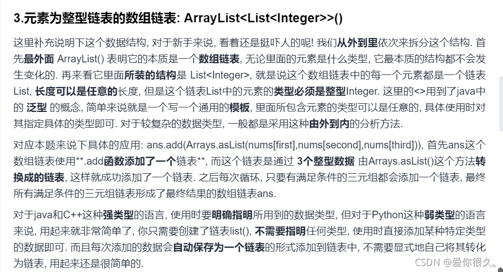 List<List<Integer>> ans = new ArrayList<List<Integer>>(); //元素为整型链表的数组链表