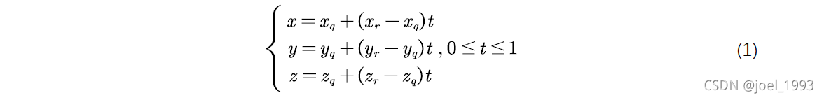 假设三维空间中有三个点P1(x1,y1,z1), P2(x2,y2,z2), P3(x3,y3,z3)三个点构成一个三角形,另外有两个点Q(xq,yq,zq),R(xr,yr,zr)构成一条空间线段。那么怎么获得线段和三角形面的交点坐标呢?我们可以假设线段的坐标用参数方程表示: