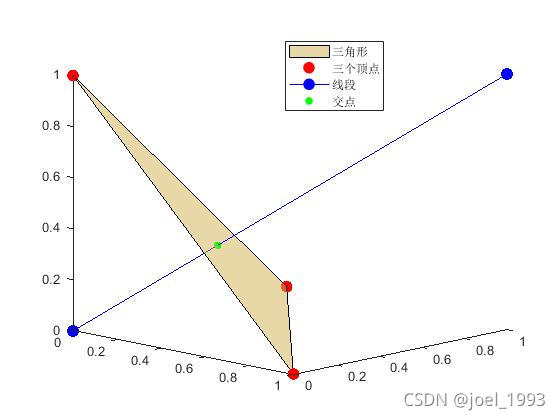 cp = crossTriSeg(p_tri, p_seg, true) cp就是交点坐标,cp是空的,说明没交点;true是要画图