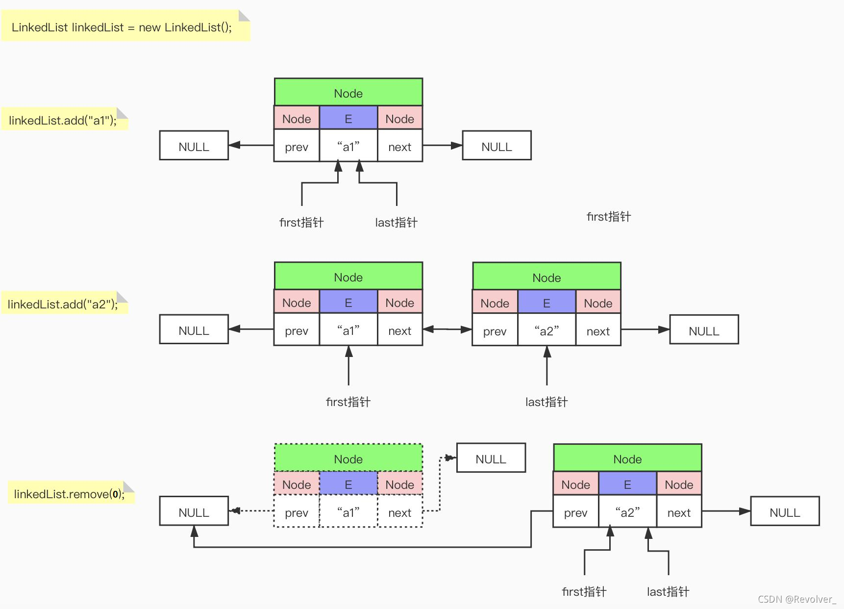 LinkedList底层是链表,所以有头指针和尾指针,在一个Node节点的头和尾需要指向下一个被链接的元素