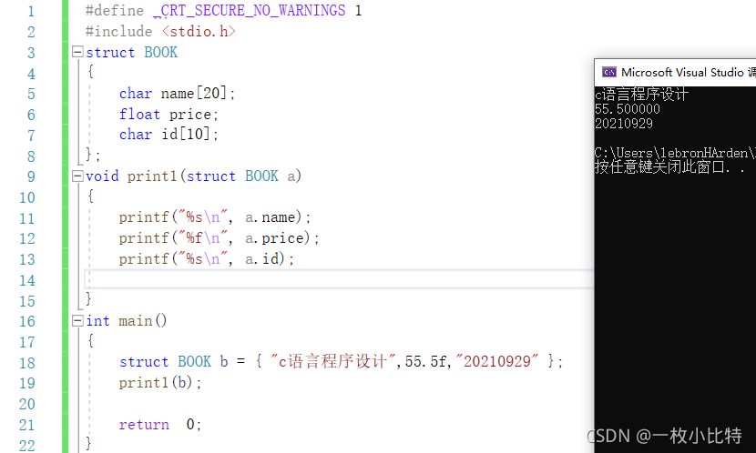 ?十一:上述代码中:a.name是数组名name,所以它是一个首地址,说这个是因为有个操作易错:如要修改“C语言程序设计”为“数据结构”,错误写法:a.name=“数据结构”;因为不可以把一个东西放在或者说赋给地址,正确操作:使用srcpy:strcpy(a.name,“数据结构”);顺便介绍一下strcpy: