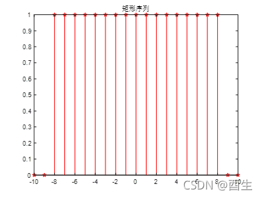 (3)输入“stem(n,x3,'rp');title('矩形序列');”回车。结果如下: