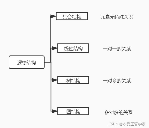 数据结构是互相之间存在一种或多种特定关系的数据元素的集合。 这句话有两个重点,“关系”和“集合”。这意味着数据结构是一个整体,“关系”则是判断元素是否属于此集合的标准。 其中,数据结构包括:逻辑结构和存储结构。