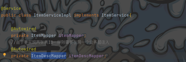 要求: 一个商品对应一个详情信息, 所以 item和itemDesc一对一 一个商品对应一个详情 一个详情对应一个商品 隐藏属性: item.id = itemDesc.id 2.2封装ItemVO对象:为了降低商品提交代码的耦合性,将大字段信息详情,采用ItemDesc对象进行封装