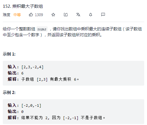 本题的子问题是找到乘积最大的所有元素吗? 不是,因为题目要求的是数组,乘积最大的若干元素可能并不相邻,所以无法构成数组。 本题的子问题应该为以 nums[i] 为结尾的乘积最大子数组。