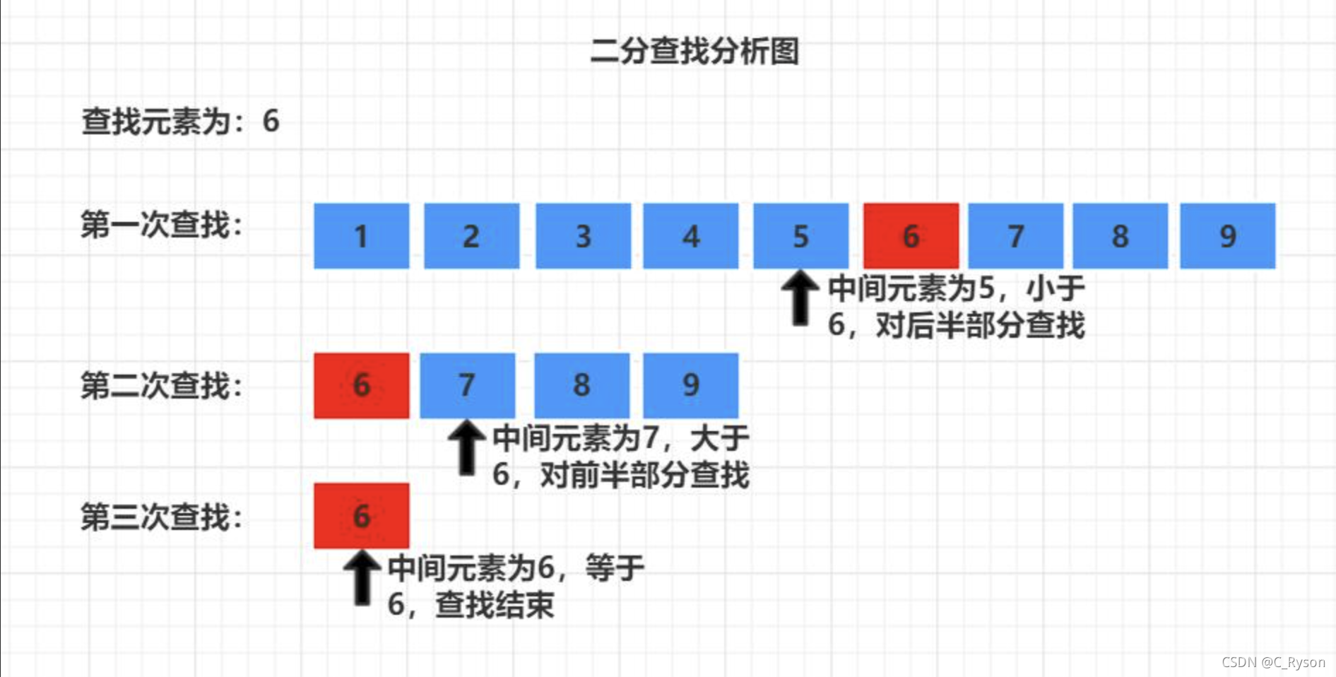 而二分查找算法就极大提高了查找的效率,每次查找完 都可以排除掉一半的元素,代码实现如下