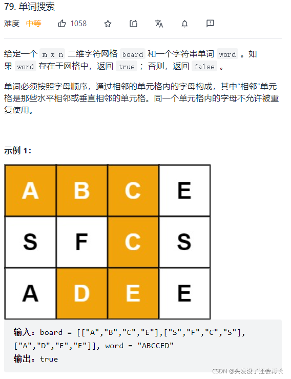 看到这种搜索问题,很快就能想到dfs,以矩阵的每一个元素为起点和字符串的第一个元素为起点分别dfs,当我们遍历到字符串的最后一个字符也相等了,就说明word存在于网格中,故dfs要有一个参数m记录此时遍历的字符串的位置,将board和word也作为dfs函数参数,还有此刻遍历的矩阵的位置,我们用i,j来表示此时遍历到第i行第j列,题目里还有说同一个单元格的元素不能被重复用,故我们还要有一个标志单元格的元素是否被使用的标记数组。然后就可以开始dfs了,单元格的元素可以向四个方向搜索,只要有一个方向相等就可以。
