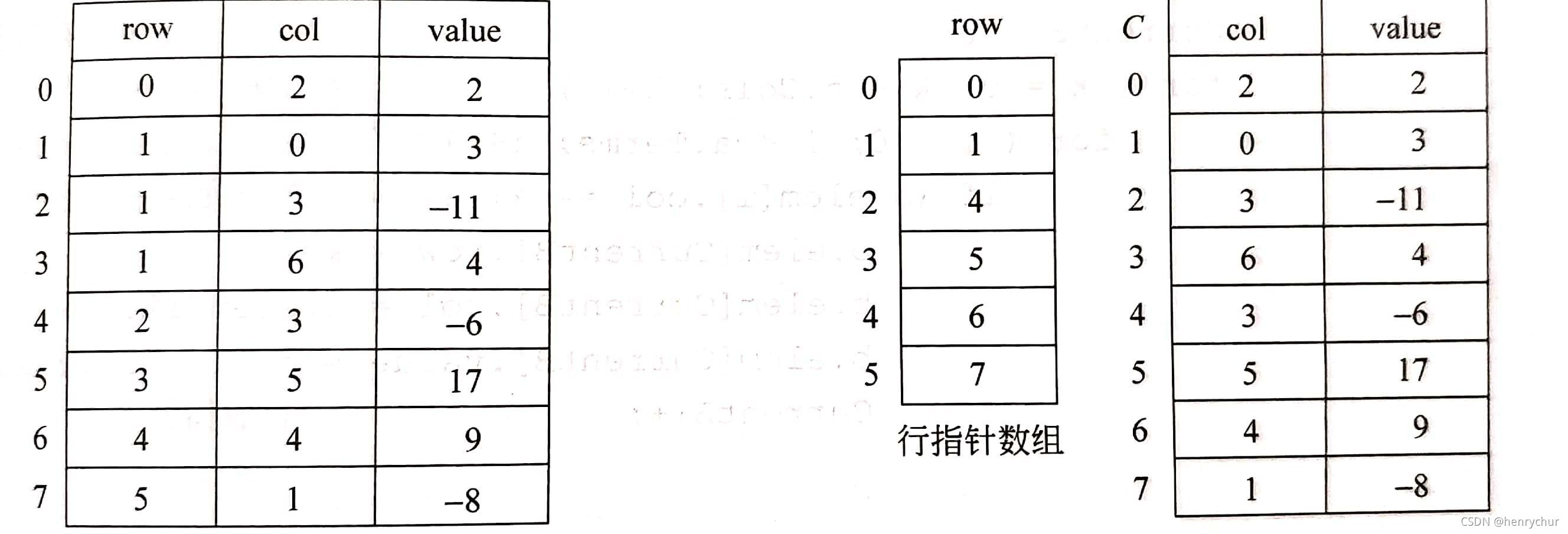 这种最原始的三元组数序表在进行操作时很不方便。比如,矩阵以二维数组存储时,可以根据行列坐标索引直接访问元素,但是按照三元组数序表存储时,仅有将整个顺序表遍历一遍找到对应的行列坐标,才能找到这个元素,效率大幅降低。 因此,我们可以采用带行地址数组的二元组顺序表。将行rows单独列出来,开一个一维数组,数组下标代表行数,对应的值代表这一行元素在二元组顺序表中的起始位置。  左图为三元组顺序表,右图为带行地址的二元组顺序表