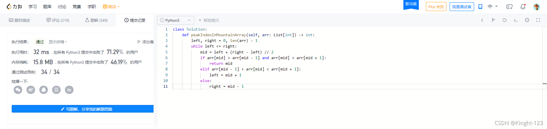 剑指 Offer II 069. 山峰数组的顶部 符合下列属性的数组 arr 称为 山峰数组(山脉数组) : arr.length >= 3 存在 i(0 < i < arr.length - 1)使得: arr[0] < arr[1] < … arr[i-1] < arr[i] arr[i] > arr[i+1] > … > arr[arr.length - 1] 给定由整数组成的山峰数组 arr ,返回任何满足 arr[0] < arr[1] < … arr[i - 1] < arr[i] > arr[i + 1] > … > arr[arr.length - 1] 的下标 i ,即山峰顶部。