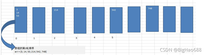 //针对每一轮,每个元素对应的位数进行排序(第一次是个位,第二次是十位。。。)