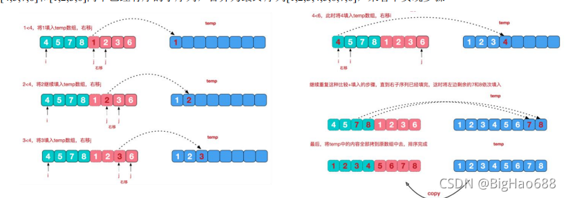 //1、把两个有序序列按照规则填充到temp数组中,直到一方已经处理完毕