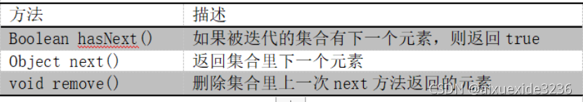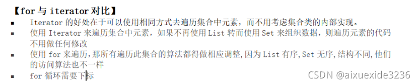 ?在面向对象的编程中,迭代器模式是一种设计模式,是一种最简单也最常见的设计模式 ?* 它可以让用户透过特定的接口寻访容器中的每一个元素,而不用了解底层的实现 ?* 获取该集合的迭代器对象 ?* Iterator it=集合对象.iterator(); ?* ? ? ? ? ? ? ? 三个方法: ?* ? ? ? ? ? ? ? ? ? ? ? 1 boolean hasNext():判断下面有没有元素,如果有就返回true,没有就返回false ?* ? ? ? ? ? ? ? ? ? ? ? 2 E next():获取下一个元素,并指向下一个元素 ?* ? ? ? ? ? ? ? ? ? ? ? 3 remove(): 删除当前指向的元素 ?* ? ? ? ? ? ? ?三个方法的使用步骤就是1,2,3,按照这个顺序调用 ?* ? 注意 : 迭代器一旦创建,集合中就不能添加和删除元素(长度就不能更改了) ?* ? ? ? ? ? ?如果添加或者删除了元素,那么迭代器必须重新生成 ?* ? 增强for循环:就是为了让用iterator循环访问的方式简单,写起来更方便,当然功能不太全,比如删除时还是要用iterator来删除